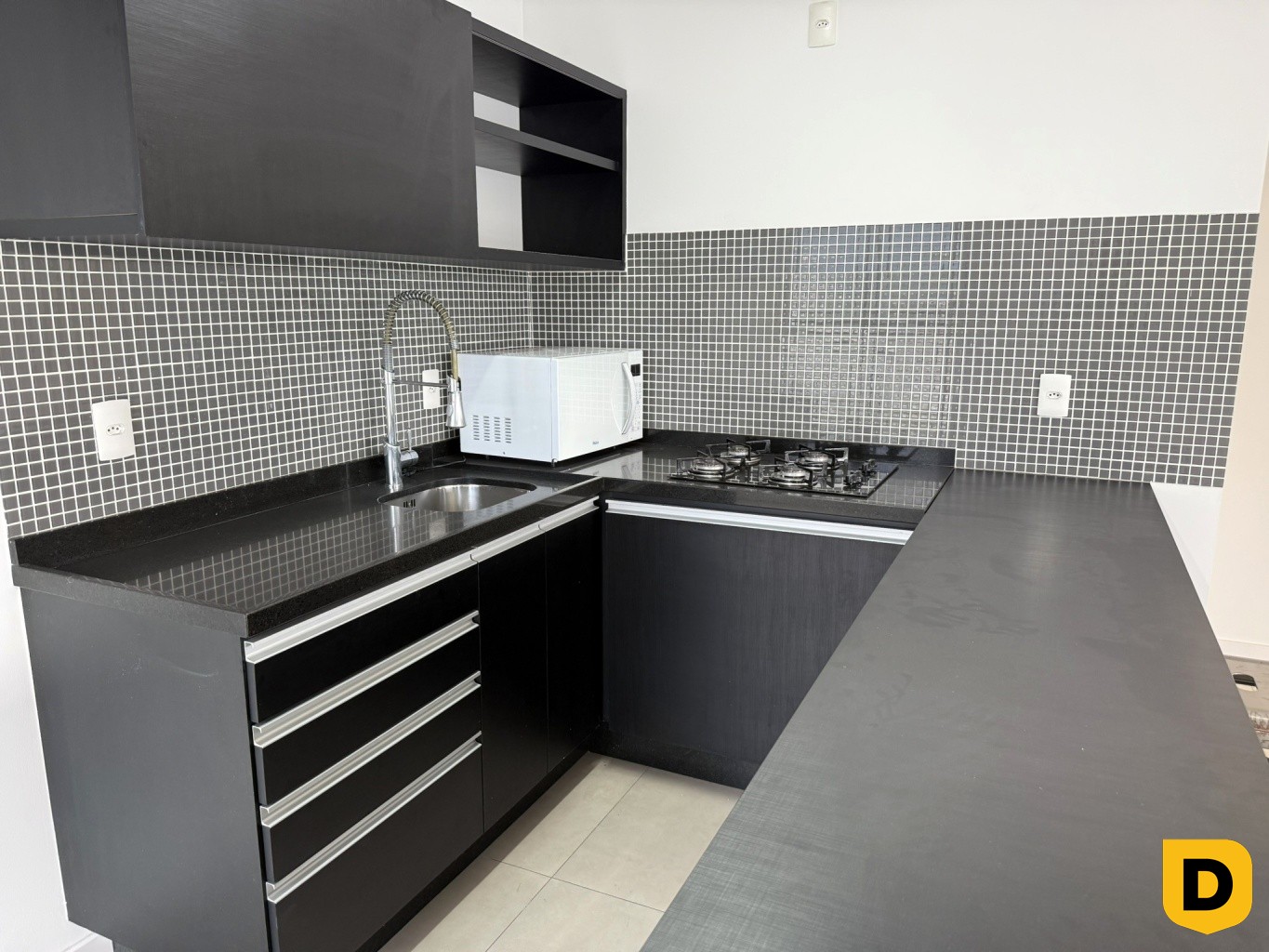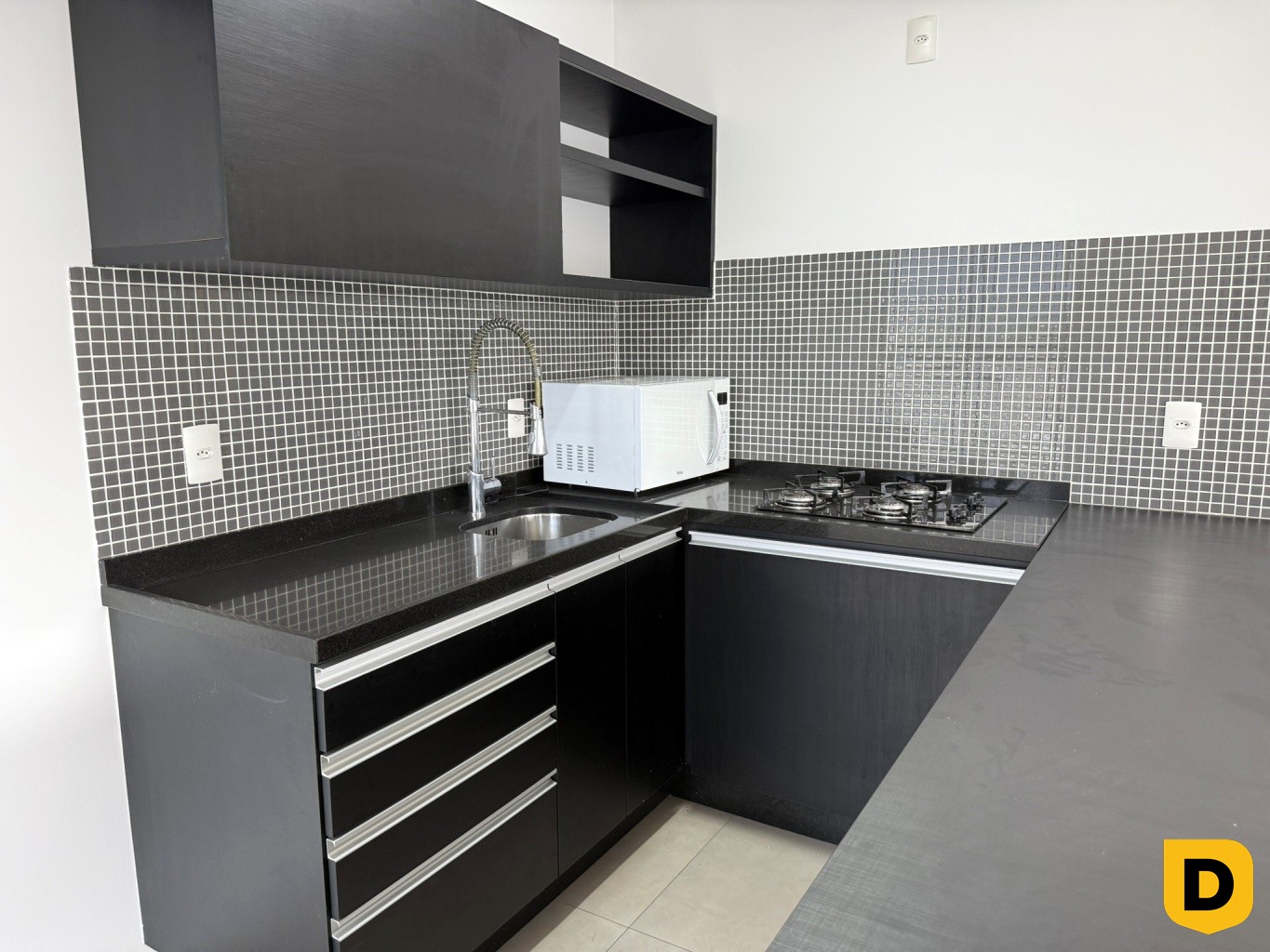 * Cozinha planejada, com bancada, cuba e cooktop