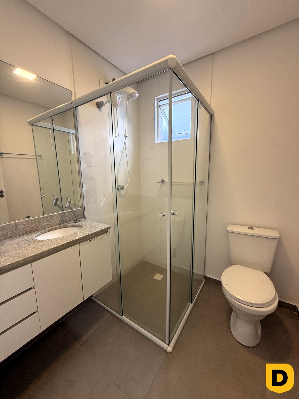* Banheiro com bancada, espelho e box em vidro, alem de ventilacao natural
